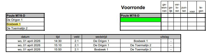 1 april 2026: 14.30 uur De Origon 1 – Bosbeek 1